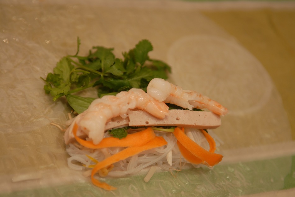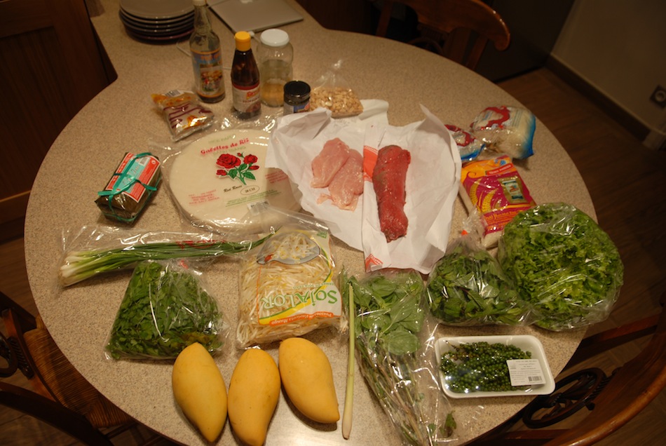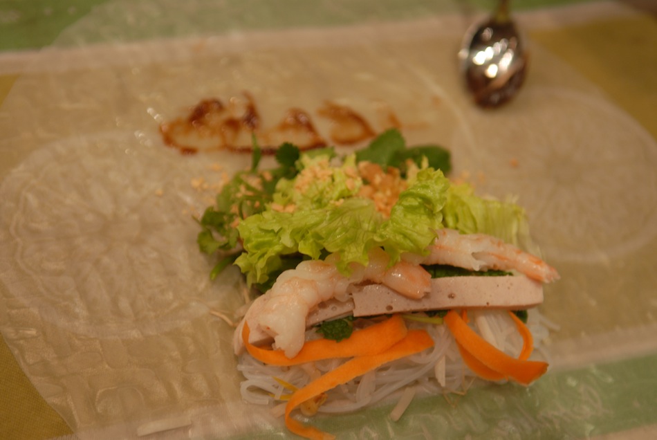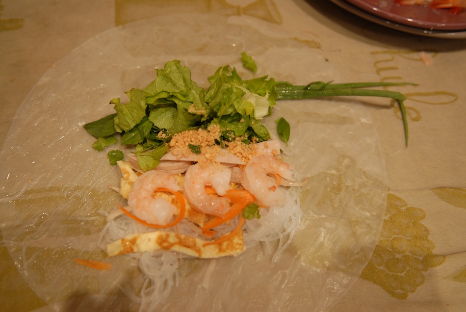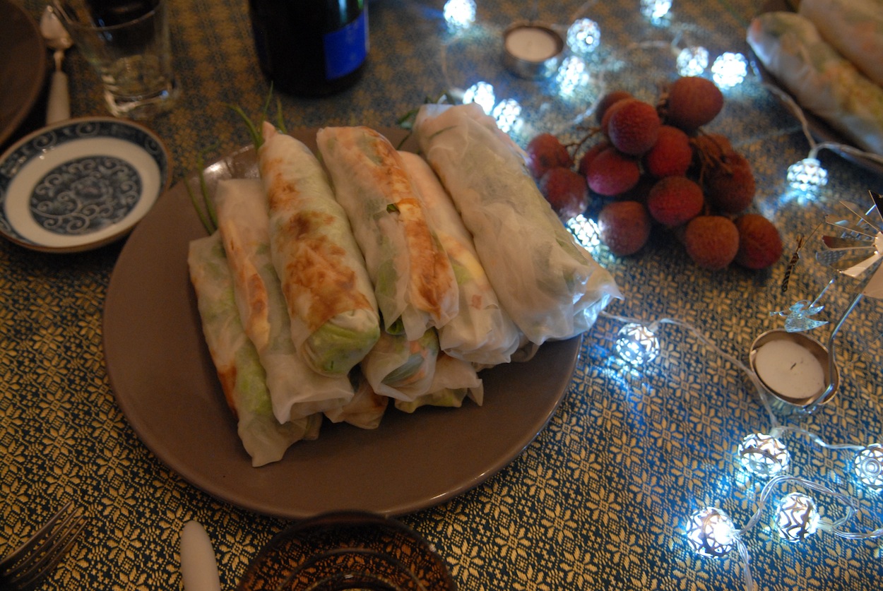 Pour réussir cette recette, il faut inviter le neveu de Tonton Ming. Faire les courses chez Tang avec lui, on est déjà en Asie. Revenir avec une montagne de produits frais pour les rouleaux de printemps, le poulet au basilic et le boeuf au poivre vert. Ouvrir une bonne bouteille de vin blanc et… laver, couper, tailler, assaisonner, mariner, parfumer… Vous passez une bonne heure et demie, dans la bonne humeur, à tout préparer et à confectionner les rouleaux.