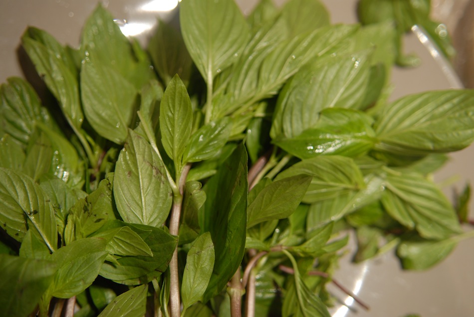 • des bouquets frais de ciboule (ou ciboulette), soja, menthe, coriandre, basilic vietnamien, 1 salade, 1 carotte, 3 gousses d’ail