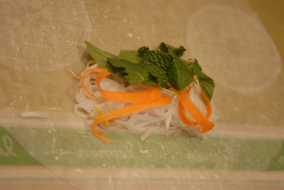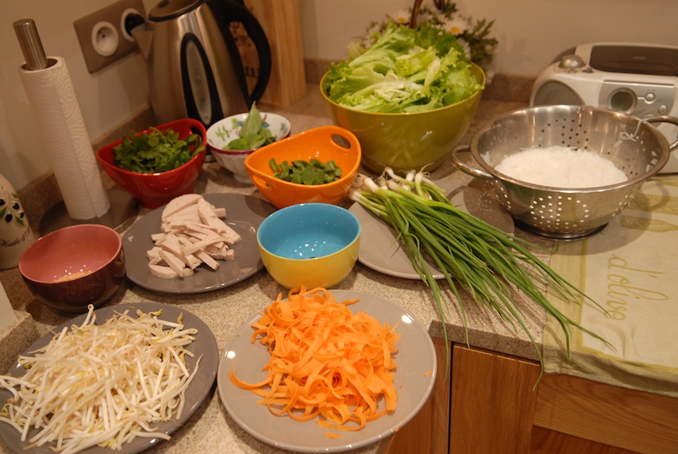– Couper, tailler tous les légumes, faire tremper le vermicelle, faire une fine omelette et la couper en lanière, couper en petits bâtonnets le paté vietnamien, effiler la carotte.