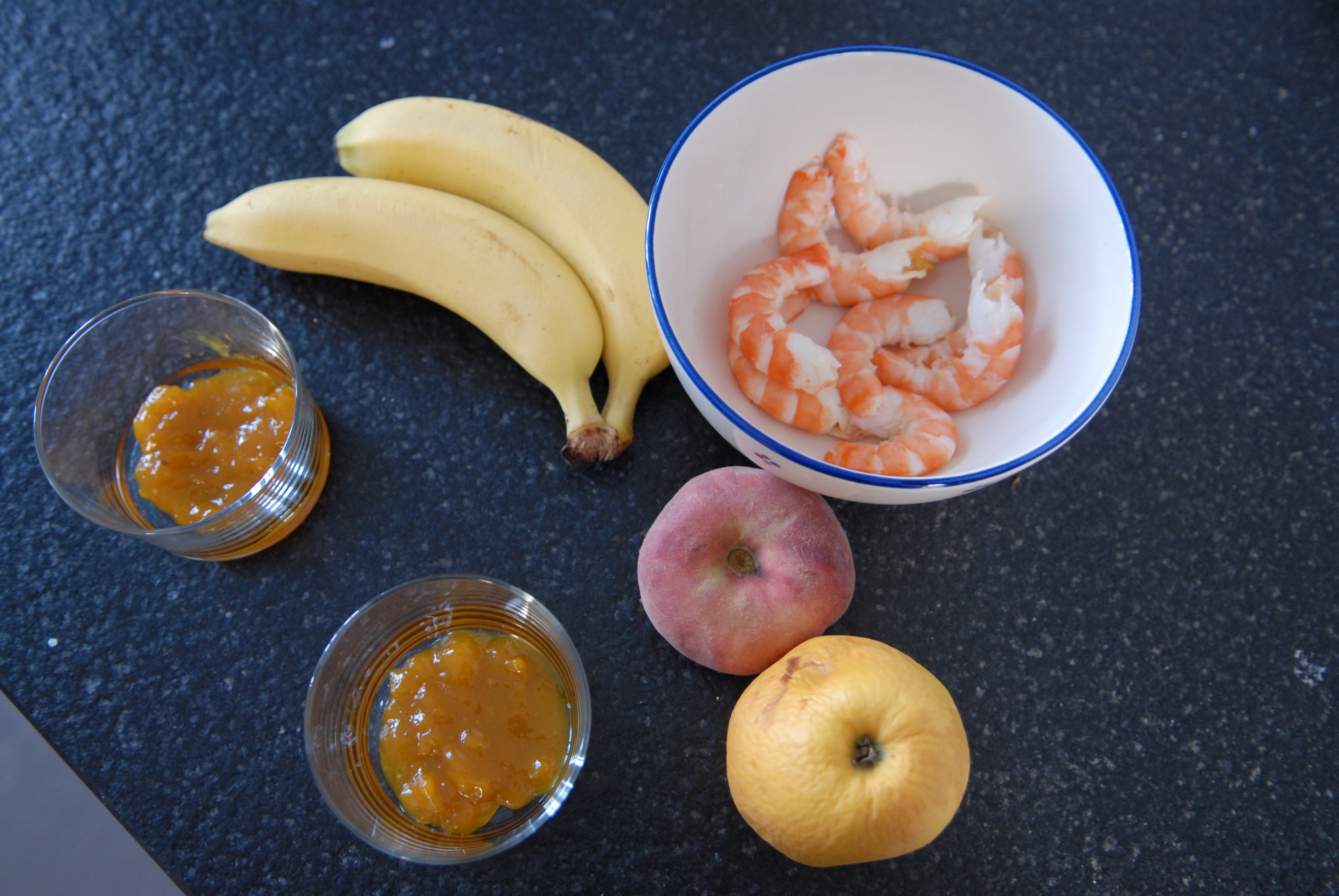 Décortiquer les crevettes, couper en dés les fruits.