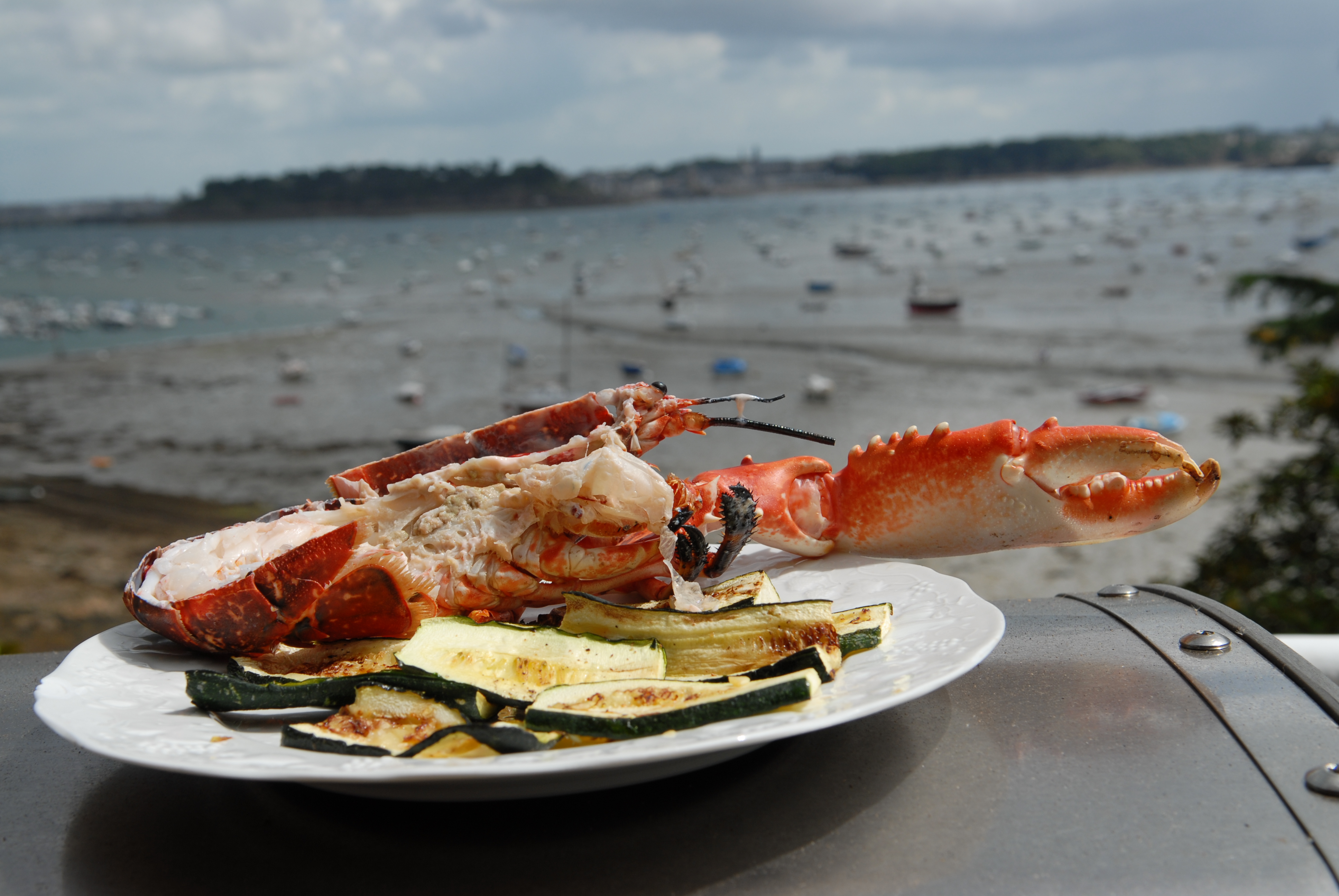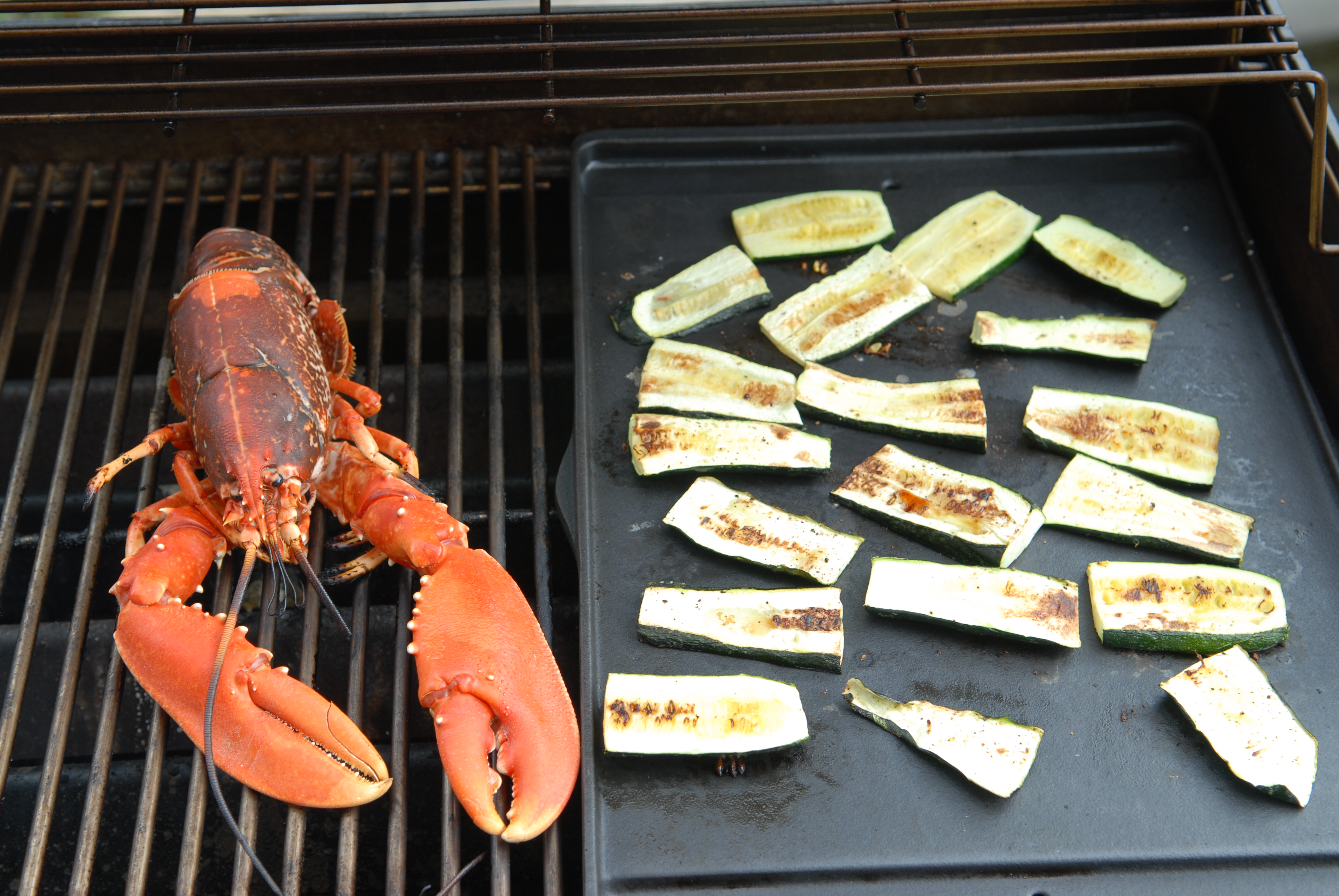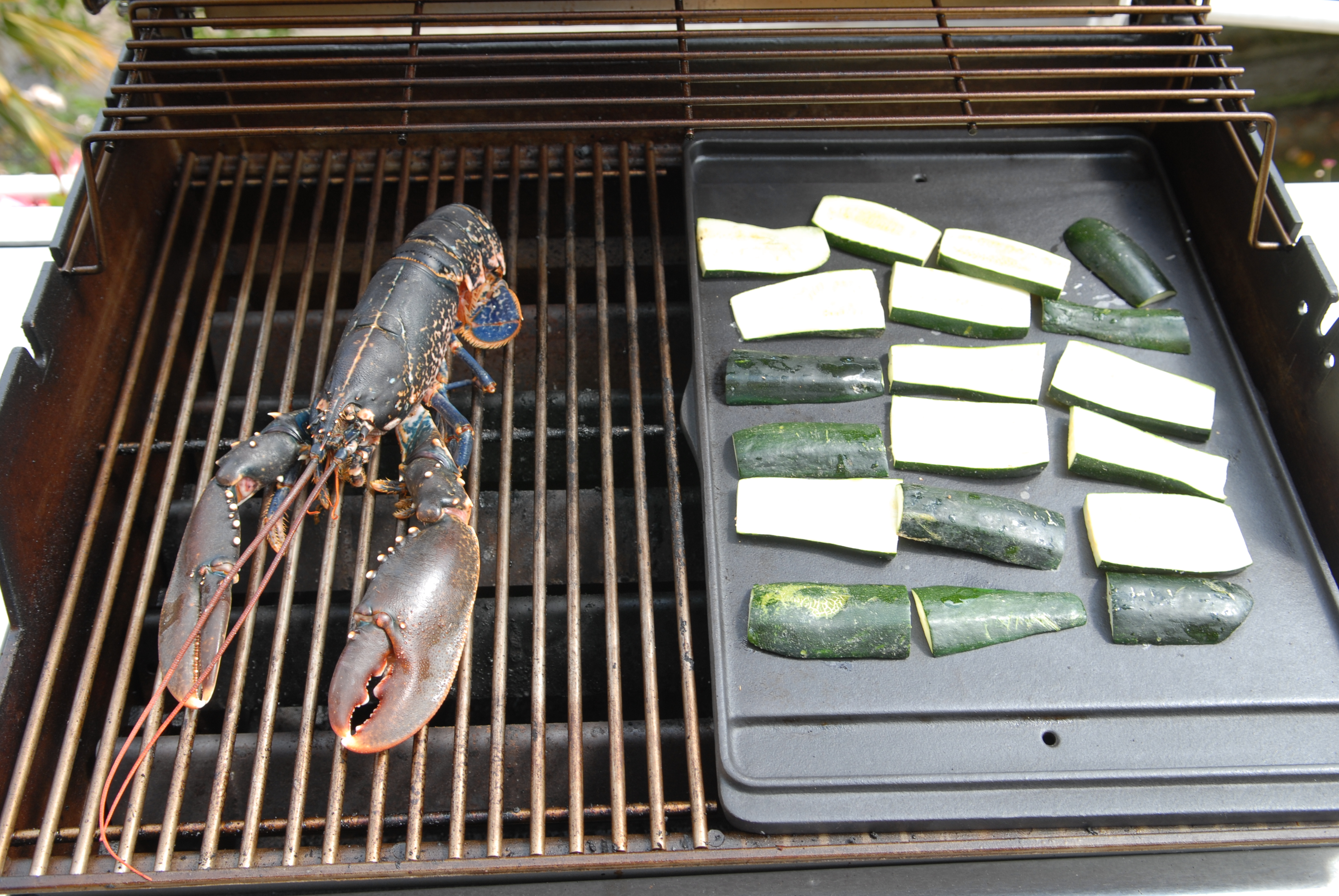 Disposer sur le barbecue le homard et sur la plancha les courgettes.