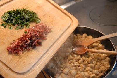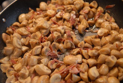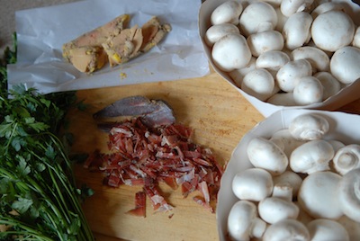 Une entrée étonnante , inventée un dimanche matin : des champignons cuits avec du foie gras et parfumés avec des pépites de poitrine fumée…